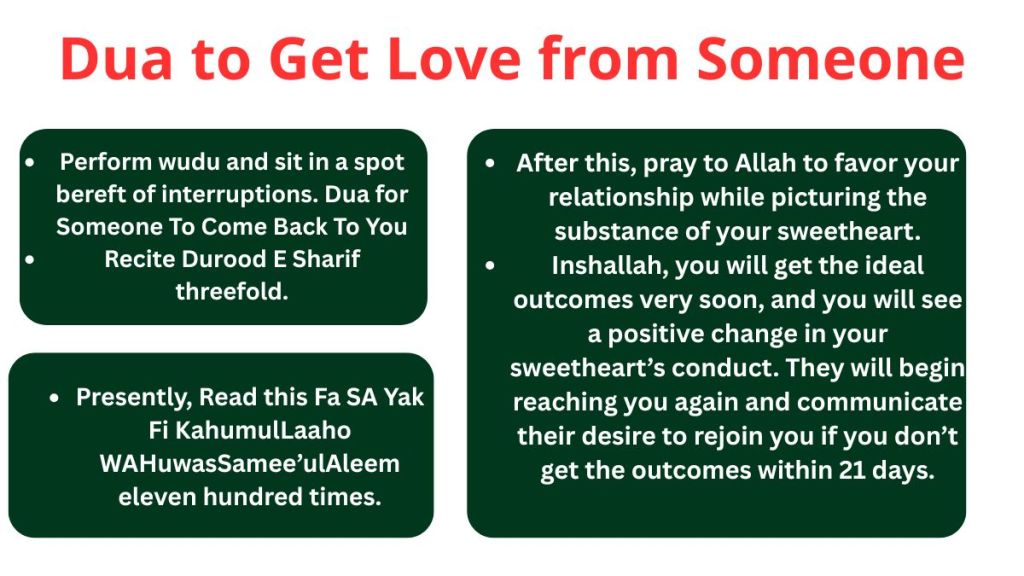 Play out this dua to get love from somebody after your required petitions and see the marvel. Inshallah, the individual you love will begin indicating enthusiasm for you and communicate their sentiments of affection for you very soon! You can likewise utilize this dua to bring back your darling from the snare of some other individual. If your accomplice has fallen snared in the adoration for some other individual, this dua to bring your darling back will be your hero.